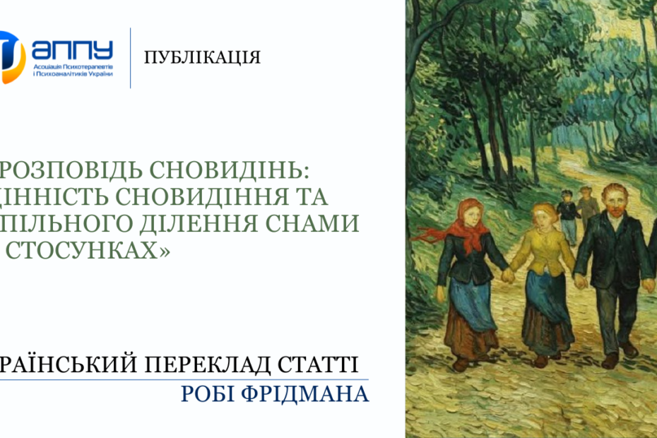 У цій роботі автор розгортає груп-аналітичне розуміння сновидіння як не лише індивідуального, а й реляційного та колективного процесу. Йдеться про сновидіння як форму психічного «травлення», що народжується з колективного занепокоєння, проходить через особистий досвід сновидця і завершується спільним опрацюванням у групі – в тому, що Фрідман називає «розповіддю сновидіння».